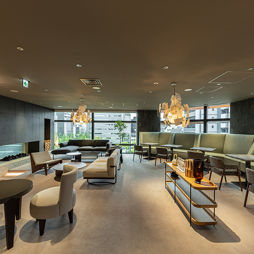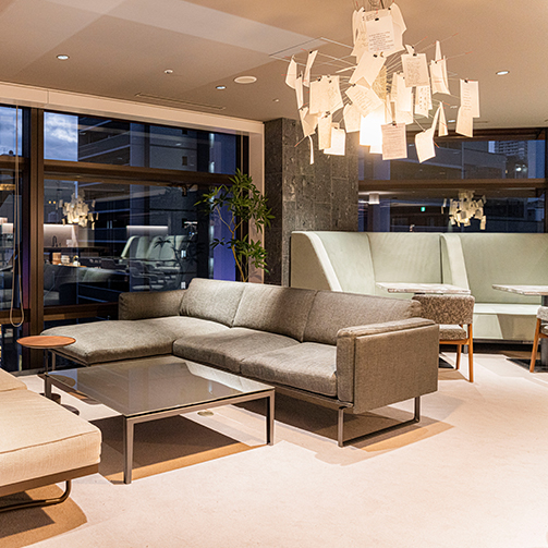 御堂筋を望むコーナーにはプライベートエリア専用のサブラウンジを配置。休憩や打ち合わせ等で、快適に使える環境を整えました。